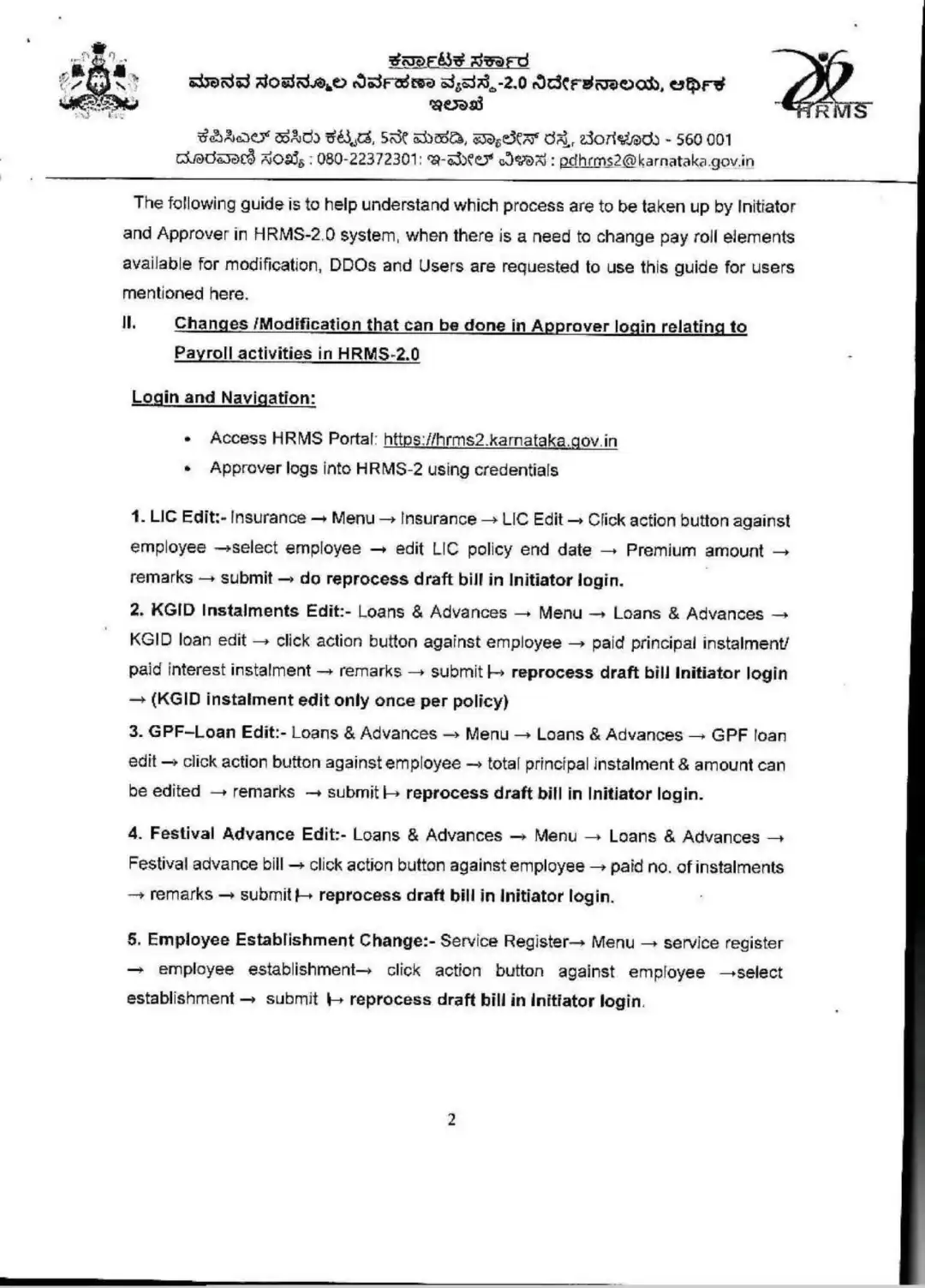 HRMS-2.0 ನಲ್ಲಿನ ವೇತನದಾರರ ಚಟುವಟಿಕೆಗಳಿಗೆ ಸಂಬಂಧಿಸಿದಂತೆ ಅನುಮೋದಕ ಲಾಗಿನ್ನಲ್ಲಿ ಮಾಡಬಹುದಾದ ಬದಲಾವಣೆಗಳು / ಮಾರ್ಪಾಡುಗಳು.