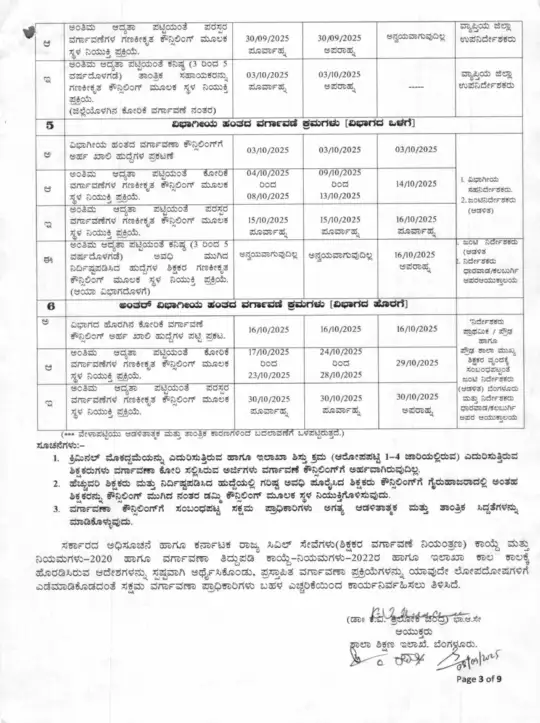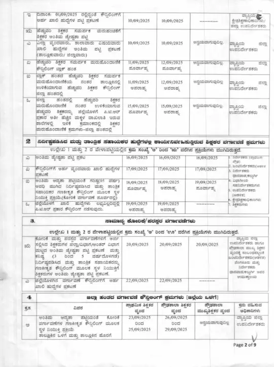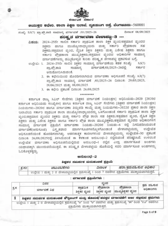 ಆಡಳಿತಾತ್ಮಕ ಕಾರಣಗಳಿಂದ ವೇಳಾಪಟ್ಟಿಯನ್ನು ಉಲ್ಲೇಖಿತ-3ರ ಪ್ರಕಟಣೆ ದಿನಾಂಕ: 26/08/2025ರಲ್ಲಿ ತಿಳಿಸಿರುವಂತೆ ಈ ಕೆಳಕಂಡ ಅನುಬಂಧ-2 ರಲ್ಲಿರುವಂತೆ ಪರಿಷ್ಕರಿಸಿದೆ. ಉಳಿದಂತೆ ಉಲ್ಲೇಖಿತ ವರ್ಗಾವಣಾ ಅಧಿಸೂಚನೆಯಲ್ಲಿರುವ ಅನುಬಂಧ-1 ರಲ್ಲಿನ ಎಲ್ಲಾ ಮಾರ್ಗಸೂಚಿ ಅಂಶಗಳು ಯಥಾವತ್ತಾಗಿ ಮುಂದುವರೆಯುತ್ತವೆ. ಈ ಪರಿಷ್ಕೃತ ವೇಳಾಪಟ್ಟಿಯ ಜೊತೆಯಲ್ಲಿ ಸದರಿ ಮಾರ್ಗಸೂಚಿ ಅಂಶಗಳನ್ನು ಓದಿಕೊಳ್ಳತಕ್ಕದ್ದು.