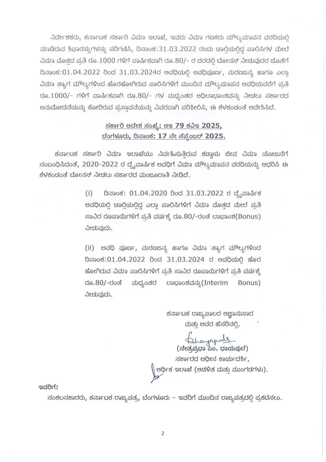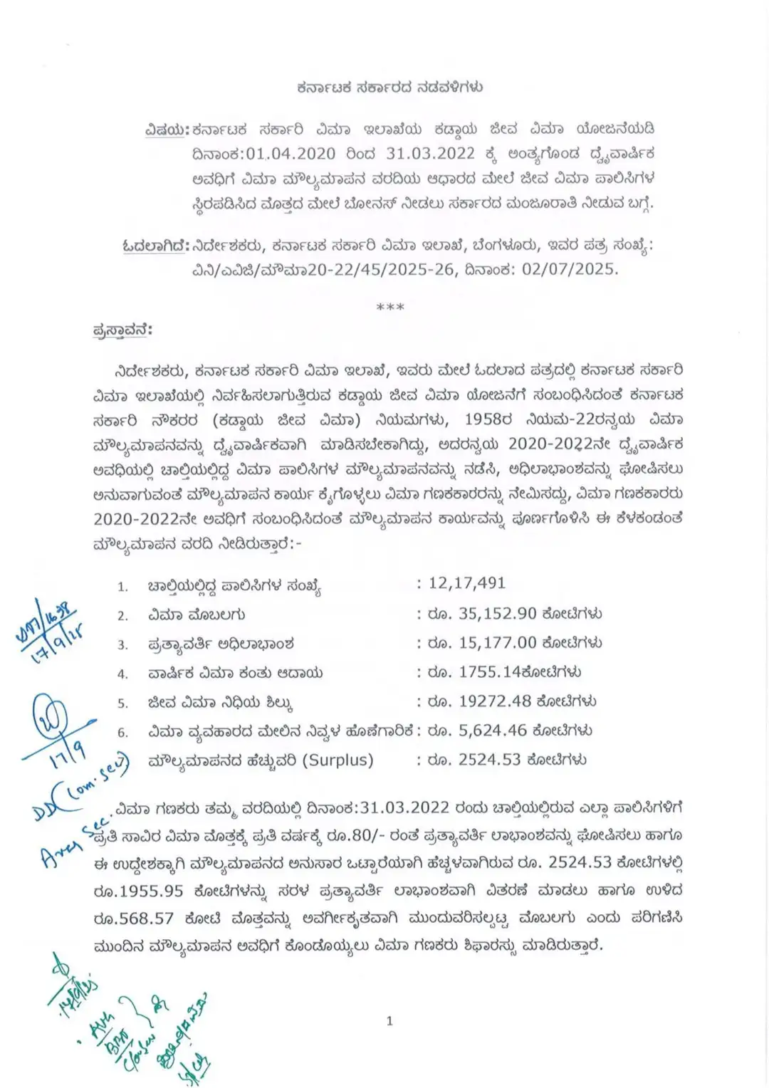 ಕರ್ನಾಟಕ ಸರ್ಕಾರಿ ವಿಮಾ ಇಲಾಖೆಯು ನಿರ್ವಹಿಸುತ್ತಿರುವ ಕಡ್ಡಾಯ ಜೀವ ವಿಮಾ ಯೋಜನೆಗೆ ಸಂಬಂಧಿಸಿದಂತೆ, 2020-2022 ರ ದೈವಾರ್ಷಿಕ ಅವಧಿಗೆ ವಿಮಾ ಮೌಲ್ಯಮಾಪನ ವರದಿಯನ್ನು ಆಧರಿಸಿ ಈ ಕೆಳಕಂಡಂತೆ ಬೋನಸ್ ನೀಡಲು ಸರ್ಕಾರದ ಮಂಜೂರಾತಿ ನೀಡಿದೆ.