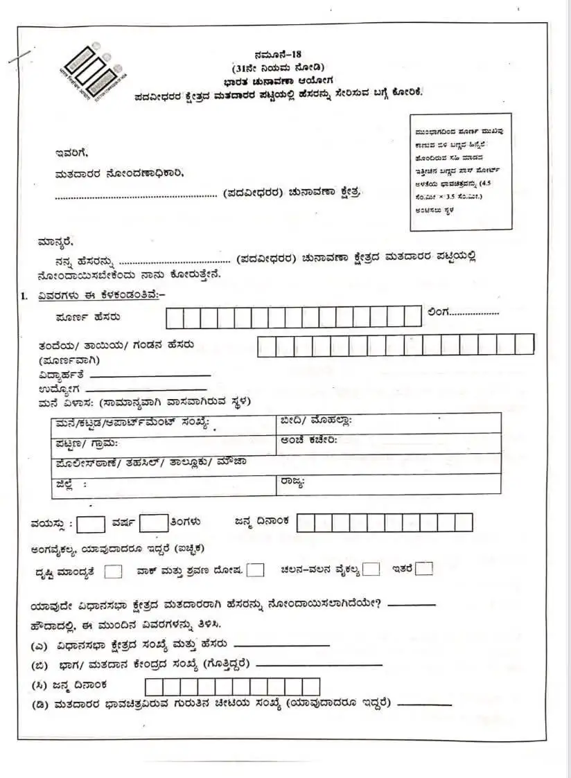 ವಿದ್ಯಾರ್ಹತೆಯ ಪ್ರಮಾಣ ಪತ್ರಗಳೊಂದಿಗೆ ಮತದಾರರ ಗುರುತಿನ ಚೀಟಿ, ಆಧಾರ್ ಕಾರ್ಡ್, ರೇಷನ್ ಕಾರ್ಡ್, ಪಾಸ್ ಪೋರ್ಟ್, ಡ್ರೈವಿಂಗ್ ಲೈಸೆನ್ಸ್, ಬ್ಯಾಂಕ್, ಕಿಸಾನ್ ಅಥವಾ ಅಂಚೆ ಕಚೇರಿ ಚಾಲ್ತಿ ಖಾತೆಯ ಪಾಸ್ ಬುಕ್ ಅಥವಾ ಚುನಾವಣೆ ಆಯೋಗ ನಿಗದಿಪಡಿಸಿದ ಇತರೆ ದಾಖಲೆಗಳನ್ನು ಗೆಜೆಟೆಡ್ ಅಧಿಕಾರಿಗಳಿಂದ ದೃಢೀಕರಿಸಿ ನಮೂನೆ-18 ಅರ್ಜಿಯೊಂದಿಗೆ ವಾಸಸ್ಥಳ ವ್ಯಾಪ್ತಿಯ ಸಹಾಯಕ ಮತದಾರರ ನೋಂದಣಾಧಿಕಾರಿ ಅಥವಾ ನಿರ್ದಿಷ್ಟಪಡಿಸಿದ ಅಧಿಕಾರಿಗಳಿಗೆ ಖುದ್ದಾಗಿ ಅಥವಾ ಅಂಚೆ ಮೂಲಕ ಅರ್ಜಿ ಸಲ್ಲಿಸಬಹುದು. ಅರ್ಜಿ ನಮೂನೆಯನ್ನು ಚುನಾವಣಾ ಆಯೋಗದ ವೆಬ್ಸೈಟ್ https://eci.gov.in/files/category/356-forms-for-registration-in-eroll/ ರಾಜ್ಯ ಚುನಾವಣಾಧಿಕಾರಿಗಳ ಕಚೇರಿ ವೆಬ್ಸೈಟ್https://ceo.karnataka.gov.in/20/download-forms/en ಮೂಲಕ ಡೌನ್ಲೋಡ್ ಮಾಡಿಕೊಳ್ಳಬಹುದು.