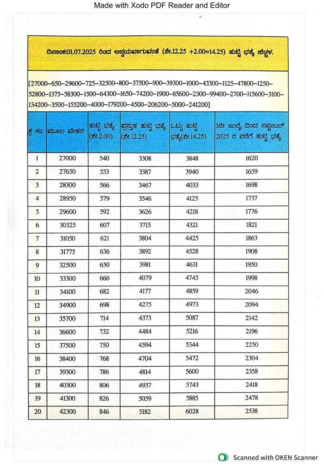 ರಾಜ್ಯ ಸರ್ಕಾರದ ನಿವೃತ್ತಿ ವೇತನದಾರರು/ಕುಟುಂಬ ನಿವೃತ್ತಿ ವೇತನದಾರರಿಗೆ ಮತ್ತು ರಾಜ್ಯದ ಸಂಚಿತ ನಿಧಿಯಿಂದ ನಿವೃತ್ತಿ ವೇತನ ಮತ್ತು ಕುಟುಂಬ ನಿವೃತ್ತಿ ವೇತನವನ್ನು ಪಡೆಯುತ್ತಿರುವಂತಹ ಅನುದಾನಿತ ಶಿಕ್ಷಣ ಸಂಸ್ಥೆಗಳ ನಿವೃತ್ತಿ ವೇತನದಾರರು/ಕುಟುಂಬ ನಿವೃತ್ತಿ ವೇತನದಾರರಿಗೂ ಸಹ ದಿನಾಂಕ 1ನೇ ಜುಲೈ 2025 ರಿಂದ ಜಾರಿಗೆ ಬರುವಂತೆ ಹಾಲಿ ಲಭ್ಯವಿರುವ ತುಟ್ಟಿಭತ್ಯೆಯ ದರಗಳನ್ನು ಮೂಲ ನಿವೃತ್ತಿ ವೇತನ/ಕುಟುಂಬ ನಿವೃತ್ತಿ ವೇತನದ ಪ್ರಸಕ್ತ ಶೇಕಡ 12.25 ರಿಂದ ಶೇಕಡ 14.25 ಕ್ಕೆ ಹೆಚ್ಚಿಸಿ ಮಂಜೂರು ಮಾಡಲು ಸಹ ಸರ್ಕಾರವು ಹರ್ಷಿಸುತ್ತದೆ.
